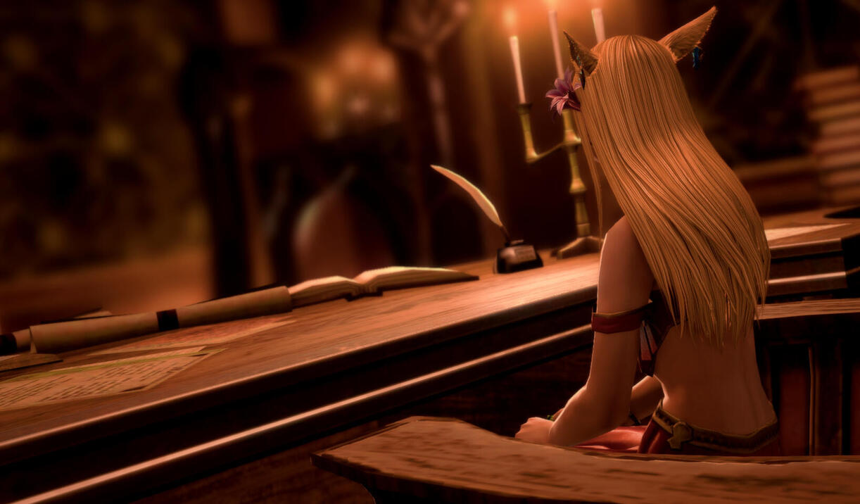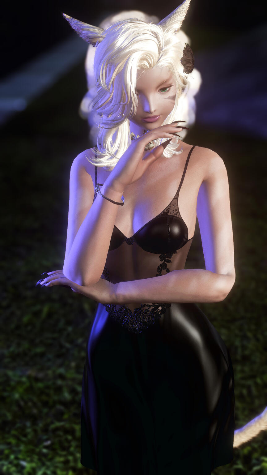 (This is a bit of history but NOT about Tyo.)A night sometime in the early part of the Sixth Astral Era, storms raged as a Seeker let out a scream signifying that her labor was coming to an end. A final push to bring life into the world; a cacophony to challenge the thunder. With the first mewling of the child, the skies parted and the storms ceased. The baby was gifted with Seeker eyes that looked like polished emeralds, a long sleek tail, and fangs. As often happens with superstitious tribes, the child’s appearance was perceived as an ill omen from the gods, rather than a quirk of nature. So she was cast out into the wilds to fend for herself.Be it a stubborn nature, a will to live, or pure instinct, she managed to survive and thrive for seventeen years in her feral home. Then, some soul thought to pluck her from all she knew, “save” her and bring her into society. This individual taught her to write, read, dress, speak, and behave. However, Violet’s wild side never stayed buried for long. Her temperament and even very nature were forever changed from her time in the wilds, and it was said all of her senses were heightened. Once the self-proclaimed savior decided Violet was suitable for society, she was sent into the world to fend for herself.Violet was quite successful making her way through the world with the same determination that kept her alive in the wilds for a number of years. However, as all things tend to do, her fortune faded. At that lowest moment, she found herself in a bar faced with a handsome stranger who fed her and made the indecent proposal to offer her a grand sum for her virginity. Despite her desperate conditions, Violet wrestled for hours whether to accept this proposal. She had never been attracted to men in her life, but this one seemed different, and she needed the money. She accepted his offer. However, when the time came to keep her end of the bargain, she wasn’t only deflowered, she was forever changed. The man was a creature who changed Violet to be like himself. Alive, yet not. Feeding on others to keep alive and youthful.For the next several centuries, it is said Violet split her time between the wilds and civilization, arriving in Coerthas shortly before Ishgard began to emerge as a city-state. This is when Violet met her first mistress. How she found her, and how they came to their agreement, and why the family settled in Ul’dah has been lost to history, but it was at this time they built the manor that would become Violet’s home. For hundreds of years, Violet was kept as a prized keepsake. Fed and watched over by her mistress, and then her mistress’s children, and so on. Violet watched the world around her change and grow. She watched generations of the family grow and pass away, but she was happy with her lot in life.Finally, the family had no more heiresses, and the last mistress’s time to leave the world had come. Violet begged her mistress to let her change her; to stay with her. But she refused. The family left safeguards in place to allow Violet to take over the estate once their line ended, so she stayed in that home for a century. A long, pointless century.